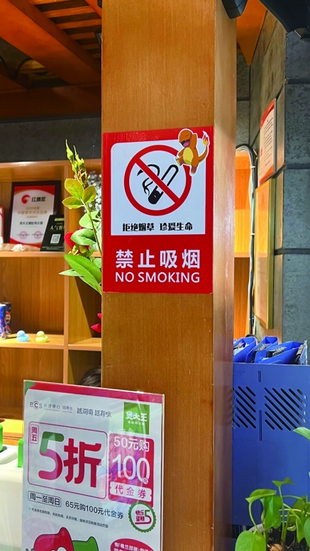 “最近,我们在商场的进出口位置都加贴了禁烟标识,以确保顾客及员工对禁烟规定的明确知晓。”长沙国金中心工作人员表示,商场还要求清洁人员佩戴禁烟徽章,主动承担起监督职责,一旦发现有人在非吸烟区吸烟,他们会立即上前礼貌劝阻,维护良好的无烟环境。