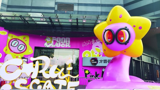长沙方圆荟世纪城店摆放的蛇装置,弱化了蛇头部特征,不但给蛇“戴”上眼镜,还配上了类似向日葵的头饰,盘旋的蛇身引来小朋友合影打卡。