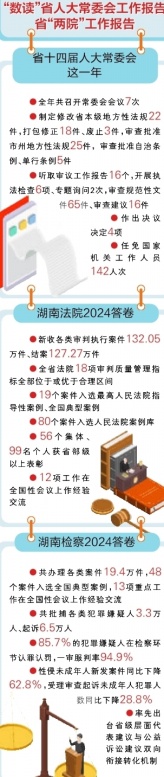 省高级人民法院院长朱玉作省高级人民法院工作报告。他说,2024年,全省法院锚定“三高四新”美好蓝图,按照“讲政治、顾大局、精主业、强队伍”总体要求和“聚焦中心大局、聚焦主责主业、两者有机结合”工作思路,忠诚履职尽责,助力建设更高水平平安湖南,服务保障经济高质量发展,依法保障民生福祉,加大生态环境司法保护力度,积极推动健全社会治理体系,全省法院新收各类审判执行案件132.05万件、结案127.27万件,有力惩治犯罪,有效定分止争,维护公平正义。全省法院18项审判质量管理指标全部位于或优于合理区间,19个案件入选最高人民法院指导性案例、全国典型案例,80个案件入选人民法院案例库,56个集体、99名个人获省部级以上表彰,12项工作在全国性会议上作经验交流。2025年,全省法院将坚持以习近平新时代中国特色社会主义思想为指导,在省委坚强领导和最高人民法院精心指导下,忠实履行宪法法律赋予的职责,结合融合深化政治建设,与时俱进服务中心大局,守正创新加快提质增效,严管厚爱锻造过硬队伍,自觉主动接受监督,坚定信心、担当作为、狠抓落实,为奋力谱写中国式现代化湖南篇章作出新的更大贡献。