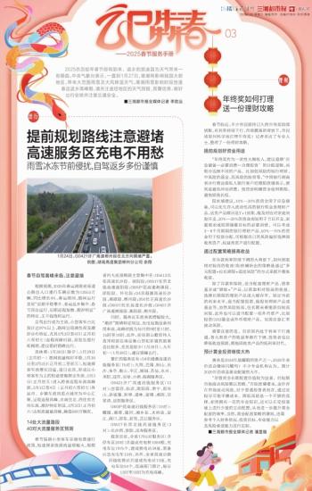 同时,服务区车流客流增幅较大,“潮汐”拥堵特征明显。充电设施设备利用率高,高峰时段为每日的9时至11时、15时至18时。此外,前往韶山瞻仰伟人故里和前往南岳衡山祭祀祈福的旅客会比较多,尤其是除夕(1月28日)、大年初一(1月29日),建议错峰出行。
