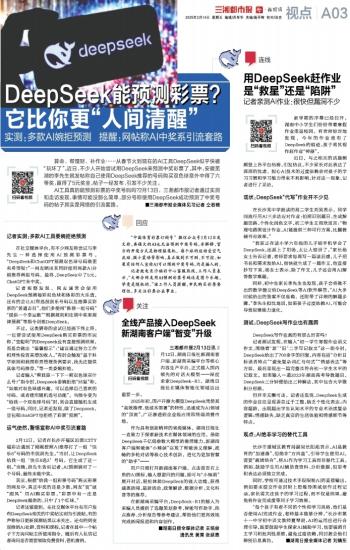 AI工具真的能预测彩票的中奖号码吗?2月13日,三湘都市报记者通过实测和走访发现,事情可能没那么简单,部分号称使用DeepSeek成功预测了中奖号码的帖子其实是网络的引流套路。■三湘都市报全媒体见习记者 仝若楠