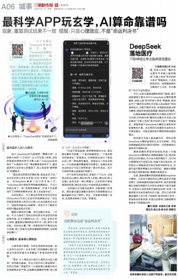 “三个问题让Deepseek寻找你的正缘”“Deepseek测算你的前世今生”……随着DeepSeek的大火,最近各大社交平台中,都席卷着一股AI算命狂潮。在最科学的APP上搞玄学,不愧是中国人对于算命的执念。那么“用AI算命”究竟是科学还是玄学呢?2月16日,三湘都市报记者采访了长沙市第三医院精神心理门诊副主任医师罗星,一探究竟。
