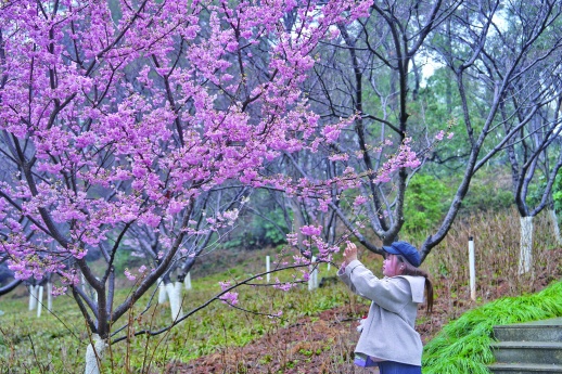 目前,植物园内盛开的是钟花樱、迎春樱、华中樱、牡丹樱等早樱品种,花色多为桃红或玫红。作为园内的“主力军”,钟花樱如倒悬的朱色铃铛缀满枝头。其花冠呈钟形,萼筒深红,似被朝霞浸染的琉璃。此花别名“寒绯樱”,耐寒且早放,在湖南湿暖的冬日里独树一帜。