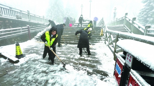 为了保障游客的游览安全与良好体验,景区工作人员迅速行动起来,手持扫帚、铁锹等工具,对景区内的主要道路、观景平台等区域进行了全面清理。景区环保车加挂防滑链,确保正常运送游客。