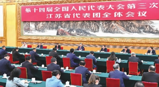 在听取大家发言后,习近平作了发言。他首先表示赞成政府工作报告,对江苏工作予以肯定,希望江苏落实好挑大梁的责任,努力取得新的更大成绩。