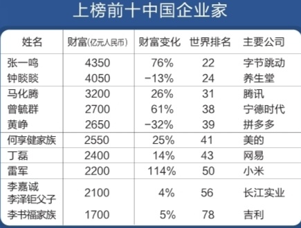 42岁的字节跳动创始人张一鸣,财富为4350亿元,较去年增长76%,取代“瓶装水大王”钟睒睒成为中国新首富,全球排名第22位,上升18位。这主要得益于字节跳动AI业务的势头和前景带来的估值上涨。