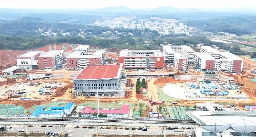长沙市一中(湘江科学城校区)是湘江科学城内重要的教育配套,也是长沙市一中“一校两址”的创新之举,建有初中部和高中部,规划96个班级,预计可容纳4200名学生在校学习、食宿。“目前项目所有楼栋都已完成封顶,正在推进主体内外装修、室外附属设施、田径场和园林景观等施工,计划今年6月建成,9月开学。”项目负责人介绍道。