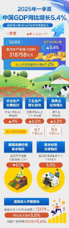 国家统计局4月16日发布的数据显示,初步核算,一季度国内生产总值(GDP)318758亿元,按不变价格计算,同比增长5.4%,比上年四季度环比增长1.2%。 新华社 图