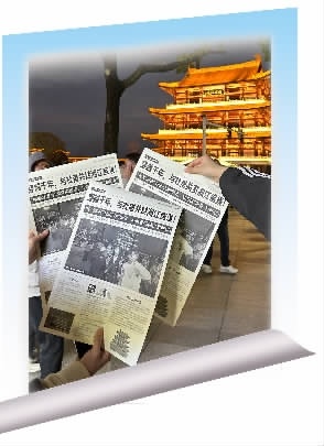 现在每天下午3时开始,这里就会排起长长的队伍,游客们手拿A3大小的黑白“报纸”,与杜甫江阁合影。