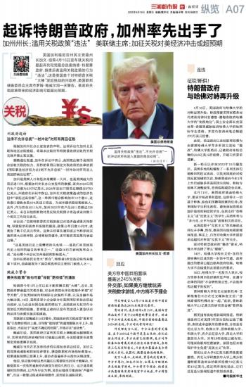 加州是美国人口和经济规模第一大州,也是美国最大的商品进口州。根据加州州长办公室发布的数据,该州2023年国内生产总值为3.9万亿美元,2024年进出口贸易总额接近6750亿美元。州政府在诉状中指出,加州在关税政策造成的经济负担中“承担过高份额”。这一举措可能会影响加州12个港口,这些港口接收全美40%的进口商品,为该州提供稳定税收收入。此外,作为农业出口大州,加州2022年农产品出口总额达236亿美元,来自其他国家的对美反制关税预计将造成该州数千个相关工作岗位流失。