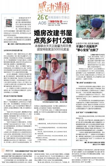 4月29日,三湘都市报联合阿里公益天天正能量为邓天贵颁发天天正能量特别奖及5000元奖金。得知获奖消息,邓天贵正在为书屋“上新”,面对突如其来的奖励,邓天贵感慨道,“看着村里的孩子们从绘本读到专业著作,就像看见当年的自己在书海里成长。十年树木,百年树人,读书学习应该是终身坚持。”邓天贵表示,准备拿奖金再添置一些书籍,也想购买电子阅读器,让村里的孩子享受电子阅读的便利。