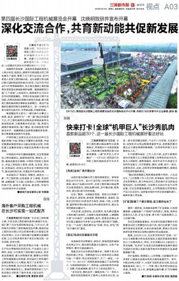 三湘都市报5月15日讯 全球工程机械50强品牌有35家参展参会,带来超30个全球首款新品;工程机械大咖和网红参与装备表演展,上演“机甲巨人空中漫步”……5月15日,第四届长沙国际工程机械展览会在长沙开幕,展期至5月18日。