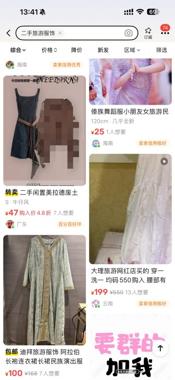 随后,记者在闲鱼平台搜索“旅行战袍”,瞬间弹出28万条搜索结果,像敦煌飞天服饰标价仅为原价三折,大理民族风长裙标注“洱海拍摄一次”,迪士尼联名公主裙强调“吊牌未拆”。在闲鱼、小红书等平台,日均超10万条旅行服饰二手交易帖发布。
