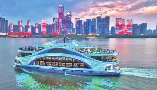 5月19日,湘江游轮码头,随着一声汽笛长鸣,湘江首艘最大新能源游轮“橘洲号”缓缓驶离三馆一厅码头,载着首批游客驶向橘子洲头,标志着长沙水上旅游正式进入绿色低碳时代。这艘融合国潮与赛博朋克风格的游轮,成为长沙文旅的新地标,也为城市夜经济注入崭新动能。