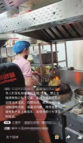 实际上,“后厨直播”并非新鲜事物,早在2022年,上海市市场监督管理局就发文鼓励实施“互联网+明厨亮灶”。记者在一家名为“superfans超级粉”的视频号直播间看到,实时画面正对着炒菜区域,一位头戴发帽和口罩的厨师正在炒粉,出餐全过程和调料台都可看到。
