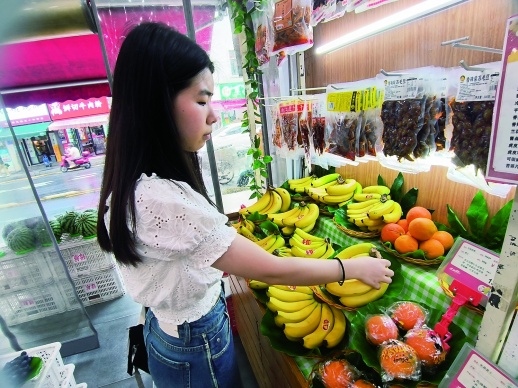 5月29日,在荷花池生鲜市场附近的果味飘香门店,金黄的香蕉被整齐地摆放在收银台旁边的水果架上。“这是老挝进口香蕉,价格为10元/公斤,都是自然成熟的,比国产香蕉更加香甜。”工作人员边收银边介绍,“店内的海南香蕉相对便宜一些,只要9元/公斤。去年同期海南香蕉价格约为7元/公斤,因为天气原因,今年香蕉价格涨了2—4元/公斤。”