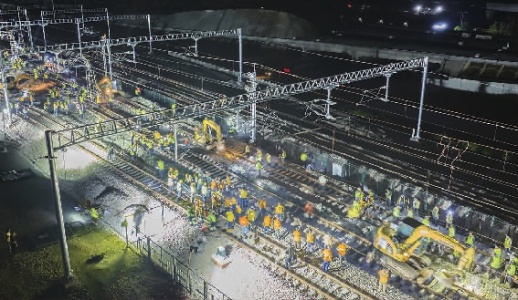 6月15日晚,由中铁二十五局集团承建的长沙高铁西站施工现场热火朝天,600余名工人利用“天窗点”奋战完成K20+740-K22+400段南侧过渡转线施工。本次转线段全长2300米,其中预铺段长度1800米,采用双线东、西头同时拨接引入新铺线路工艺。