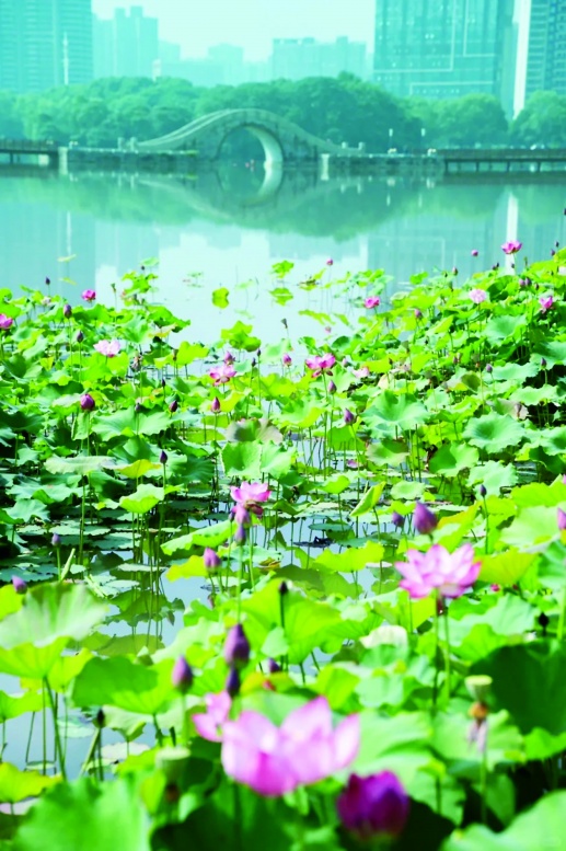 城市与自然交汇的荷花盛景