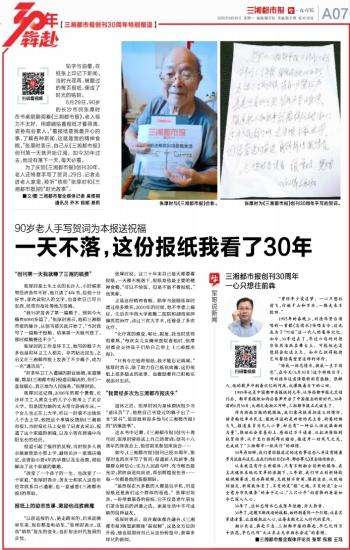为了庆贺《三湘都市报》创刊30年,老人还特意手写了贺词。29日,记者走进老人家里,聆听“铁粉”张厚时和《三湘都市报》的“时光故事”。