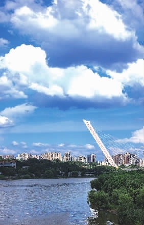 6月30日,长沙,天空湛蓝,白云舒卷,人、楼、路、桥相互映衬,构成一幅动人的夏日画卷。记者从长沙市气象台获悉,本周长沙持续晴热高温,7月1日至6日,最高气温将升至38℃左右。天气晴好,出门在外,做好防晒。