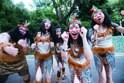 15时,正是最热的时候。记者穿上兽皮服装,和“野人”们一同站在舞台上,牵手起舞,汗水很快打湿了后背。紧接着,又试着模仿“野人们”扭腰、蹦跳,并张嘴发出“嗷呜呜”的声音。不到五分钟,就开始气喘吁吁。扭头一看,“野人天团”的演员们依然“疯得起劲”,动作一套接一套,表情丝毫不松懈。