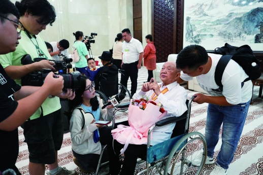 9月4日,高铁长沙南站,湖南省参加中国人民抗日战争暨世界反法西斯战争胜利80周年纪念活动代表回到长沙。图为株洲籍抗战老兵袁寿春在接受媒体记者采访。