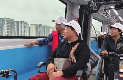 9月22日,长沙市肢残人协会组织了一场“穿梭云端无障碍之约”活动。来自长沙各区县的40名“轮友”乘坐长沙轨道交通Y1大王山旅游线,体验“空中巴士”,在城市高空将美景一览无余。