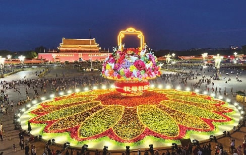 9月25日,2025年“祝福祖国”巨型花篮正式完工,亮相天安门广场与市民共度佳节。今年“祝福祖国”花坛以喜庆的花篮为主景,花坛顶高18米,篮体高16米,篮盘直径12米。篮内选取了美好寓意的花卉,其中荷花寓意“和和美美”、橄榄枝寓意“荣耀和平”等,还结合和平鸽元素,体现“和平发展、欣欣向荣”。