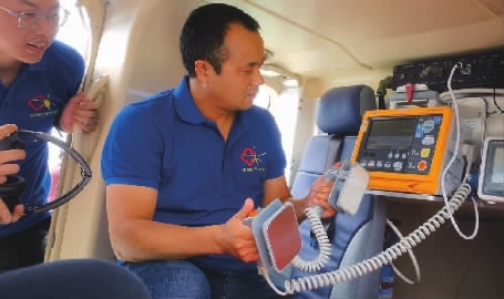 记者从直升机上看到,飞机的医疗舱可以供转运担架上下,舱内配备有呼吸机、除颤仪、输液泵、真空吸引器等急救设备。