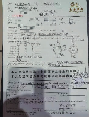 在送检之前,门店预计维修费用包括完整检修(不抛光)3800元,更换镜面1100元和更换表冠1000元,合计5900元。并注明由于为代送至服务中心,维修发票由公司东方表行开出。东方表行出具的修理单显示,匡先生的手表表壳有多处磕伤,顾客描述无走时不准的情况,镜面摔碎、指针有划痕,有第三方开过盖子。