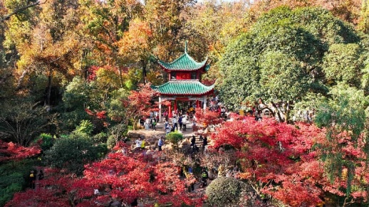 11月30日,长沙市岳麓山风景名胜区的枫叶已变红,进入最佳观赏期。被誉为“中国四大名亭”之一的爱晚亭四周红枫绚烂如火,吸引众多游客拍照打卡。