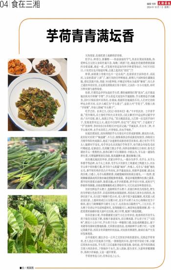 侍弄农家小菜,华容籍湘菜大厨竺小红自有妙法。他喜将切开的芋头荷子放在太阳底下晒,夜晚不拿进室内,经日晒夜露,芋头荷子有了“太阳味”。晒至六七分干时,芋头荷子生出一种脆韧口感。加盐或剁椒进坛,接下来就等待美味安静地酝酿。尤其要注意的是,处理新鲜芋头梗子时,一定要记得戴手套,因其含有草酸钙针状结晶,对皮肤有刺激性,触碰后易产生发痒发麻现象。