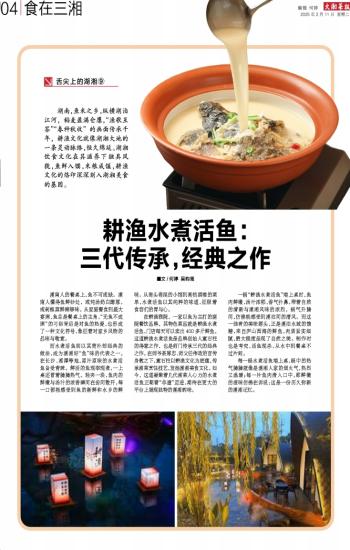在耕渔雅院,一家以鱼为主打的庭院餐饮品牌,其特色菜品就是耕渔水煮活鱼,门店每天可以卖出400多斤鲜鱼。这道耕渔水煮活鱼是品牌创始人童石柱的得意之作,也是师门传承三代的经典之作。在师爷聂厚忠、师父任伟政的言传身教之下,童石柱以耕渔文化为底蕴,传承湘菜烹饪技艺,发扬湖湘美食文化。如今,这道凝聚着几代湘菜人心力的水煮活鱼正朝着“非遗”迈进,期待在更大的平台上展现独特的湖湘韵味。