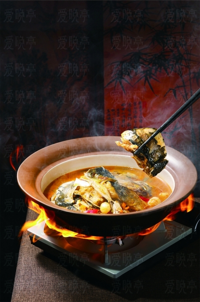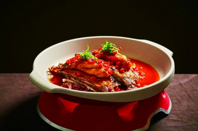 剁椒鱼头到了海南,改为水煮鱼头,同样可以呈现湖南鱼肴的至鲜。