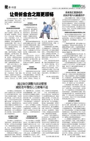 对于老年慢性心力衰竭患者而言,体位调整与活动管理是减轻不适的有效方法。在日常生活中,患者可以尝试采取坐位,并将双腿自然下垂,或是选择半坐卧位休息,即上半身与床面呈30°~60°角,以此减少回心血量,从而缓解呼吸困难和胸闷等不适症状。同时,休息或睡觉时,可以适当抬高床头,利用重力作用改善呼吸。
