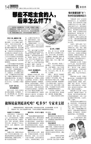 晚餐以米汤、蜂蜜水或运动饮料(不含红色/紫色色素)为主,避免固体食物及红色或紫色果汁、咖啡和奶制品。晚餐后应禁食,一般不再进食任何食物。