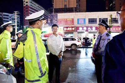 县委副书记付凯军(中)夜晚慰问一线干警。