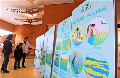 2月2日,是第25个世界湿地日,洋湖国家湿地公园科普馆,市民在参观“湿地与水”科普展。本次展览通过展板和线上宣传答题的方式,宣传水对于生物多样性的作用、湿地对生态环境的重要性等,增强人们的湿地保护意识。