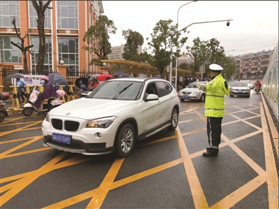 3月1日,长沙全市中小学正式开学,全市所有中小学、幼儿园护学岗将陆续启动,在学校门口及上下游路口增派民警、辅警和文明交通劝导员,加强道路交通疏导,所有执守警员实行打卡签到,确保警力按时到岗到位。巡逻警力加大对校园周边道路的巡逻力度,及时发现处置交通拥堵和突发警情。针对寄宿制学校到校、离校时间特点,在周五晚高峰和周日下午及晚高峰加强路面疏导和管控,确保开学季道路安全、畅通、有序。图为天心区交警大队九中队民警欧宪军在仰天湖桂花坪小学门口执勤护学。