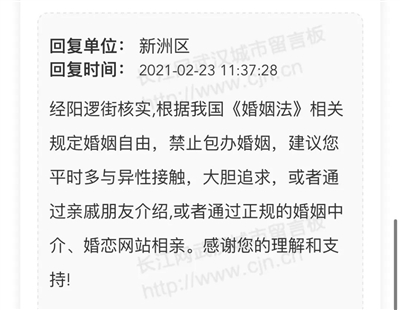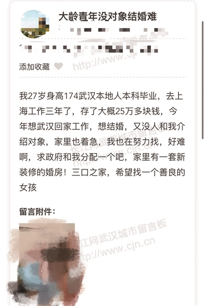 近日,武汉城市留言板上出现了一条求助,题目是“大龄青年没对象结婚难”。为了表达诚意,留言者还特地附上一张高清照片