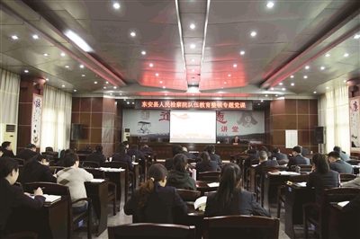 本报讯(通讯员 何英)为推动检察队伍教育整顿学习教育环节走深走实,日前,东安县检察院党组书记、检察长唐小辉以《坚持以习近平法治思想为引导 打造“四个铁一般”东安检察铁军》为题,为全院检察干警上了一堂党课。