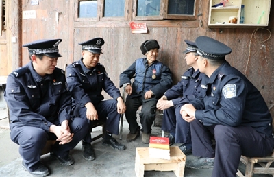 4月27日,抗美援朝老党员向全应(中)在给保靖县公安局比耳派出所的党员民警讲述革命故事。连日来,该县公安局开展“走进英雄故事 感悟党的光辉”主题活动,组织党员干部聆听当地参加解放战争和抗美援朝的老英雄讲述革命故事,牢固树立学党史、知党情、听党话、跟党走的信念。