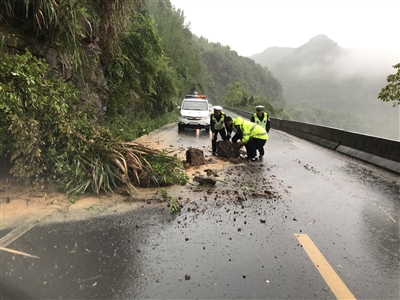 因辖区突降暴雨,为保障群众出行安全,保靖县公安局迁陵派出所迅速出动,全力抗汛防涝、排堵保畅。5月3日清晨,整个保靖城被暴雨“包围”,伴随着雷声、闪电,迁陵派出所民辅警天还没亮就已出动,联合驻村辅警对辖区所有道路进行拉网式隐患排查。排查中,民警发现辖区几处公路有不同程度的塌方、碎石滚落现象,顾不上被淋湿、被雨浇,立即在自然灾害点展开布防及清障救援,指挥过往车辆有序单边通行。