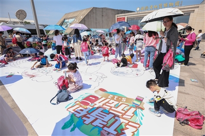 来自全省百个家庭的“萌娃”们,在地面巨幅“红背包行动”地灾防治宣传画布上尽情涂鸦。