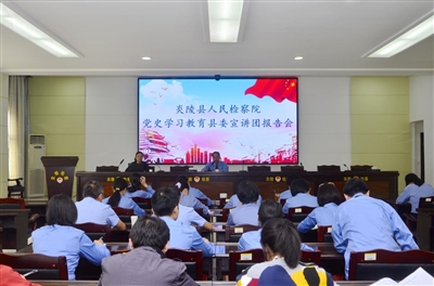 本报讯(通讯员 尹志红)5月19日,炎陵县人民检察院召开党史学习教育宣讲团报告会暨党史学习教育“学史崇德”专题研讨会。邀请县委宣讲团成员、炎帝文化研究中心主任万奇峰作党史学习教育专题宣讲报告,会议由党组副书记、副检察长廖勇主持,在家院领导及干警参加会议。
