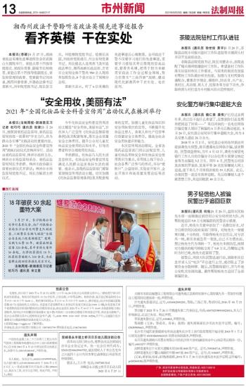 本报讯(法制周报·新湖南见习记者 杜巧巧 通讯员 张律)5月24日,按照国家药品监管局、省药品监管局的统一部署和“学史力行,我为群众办实事”实践活动的重要内容,2021年“全国化妆品安全科普宣传周”湖南启动仪式在株洲举行。活动由省药品监管局、株洲市政府主办,株洲市市场监管局承办。省药品监管局局长李赤群、株洲市政协副主席晏出席仪式并讲话;株洲市市场监管局党组书记、局长吉振君主持仪式。