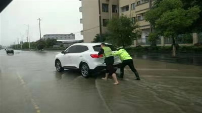 本报讯 (通讯员 道公宣)5月24日上午,道县公安局交警大队民辅警顶风冒雨,在道县城区道路积水路段执勤值守,以实际行动保障人民群众出行安全,受到过往群众和驾乘人员称赞。