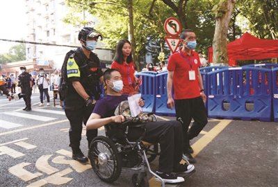 为积极做好高考安保维稳工作,长沙市公安局特巡警支队每日出动特警队员100余人、各类特种车辆20余辆,在城区10余个考点执勤站岗、巡逻值守,切实守护高考平安。为更好地服务考生,特巡警支队还在每个执勤点、每辆巡逻车上配备了口罩、文具、矿泉水、藿香正气水等物品,为有需要的考生提供帮助。图为7日上午8时许,长沙市一中考点,特警邹汉文护送一名行动不便的考生进入考场。