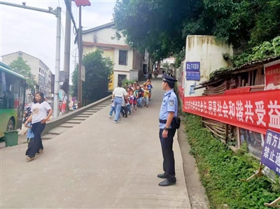 6月20日,通道县独坡派出所教导员杨保学与同事早早来到独坡中学校门口站岗执勤,迎接结束假期返校的学子们,这是通道县公安局持续开展护校安园行动的一个缩影。