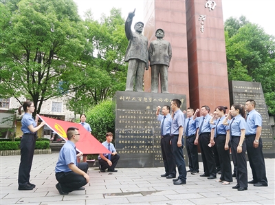 ②7月1日,花垣县检察院与重庆市秀山县检察院联合开展了主题党日活动,并在洪安镇“刘邓大军走向大西南”纪念碑前,庄严宣誓,重温入党誓词。图|梁玉婷